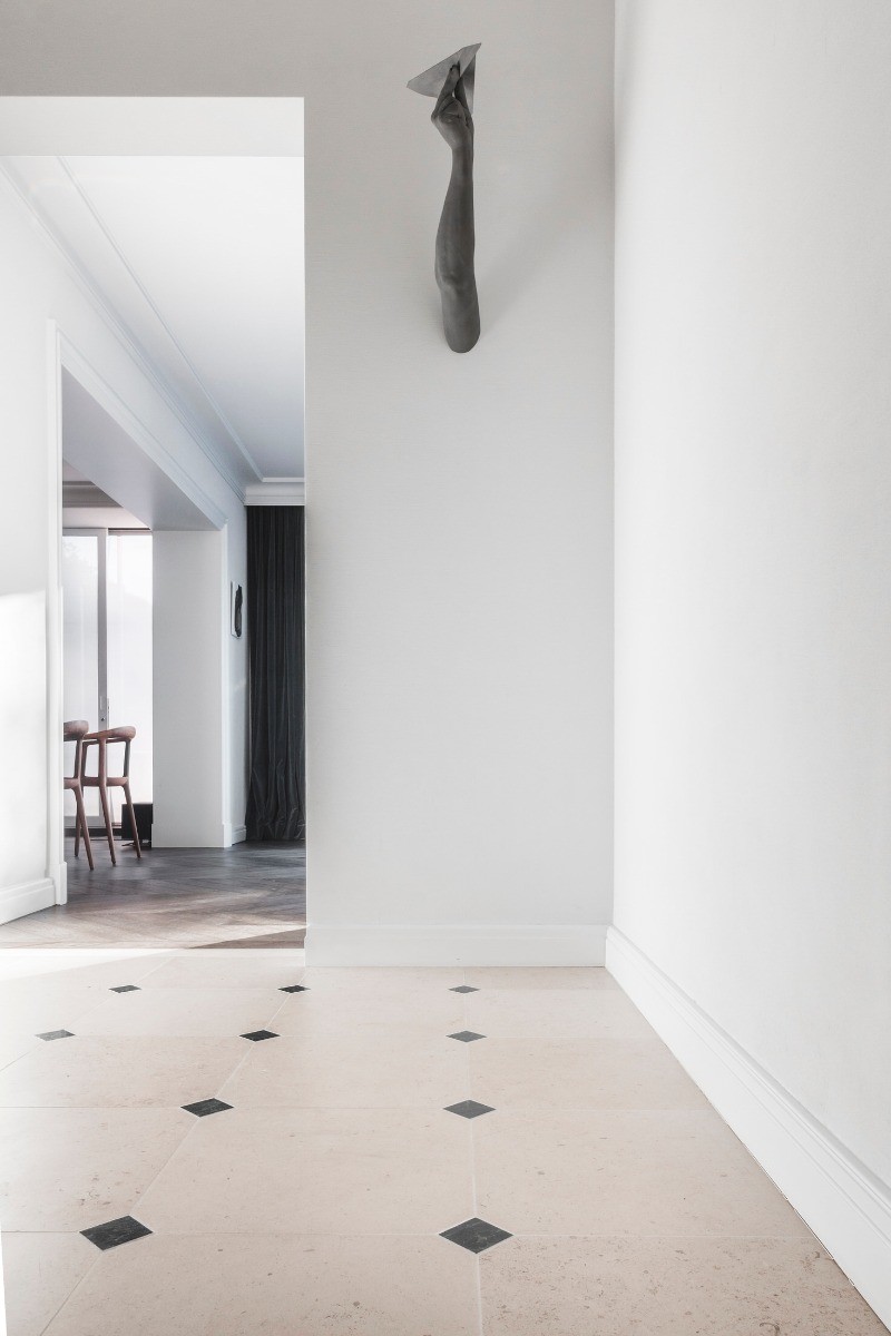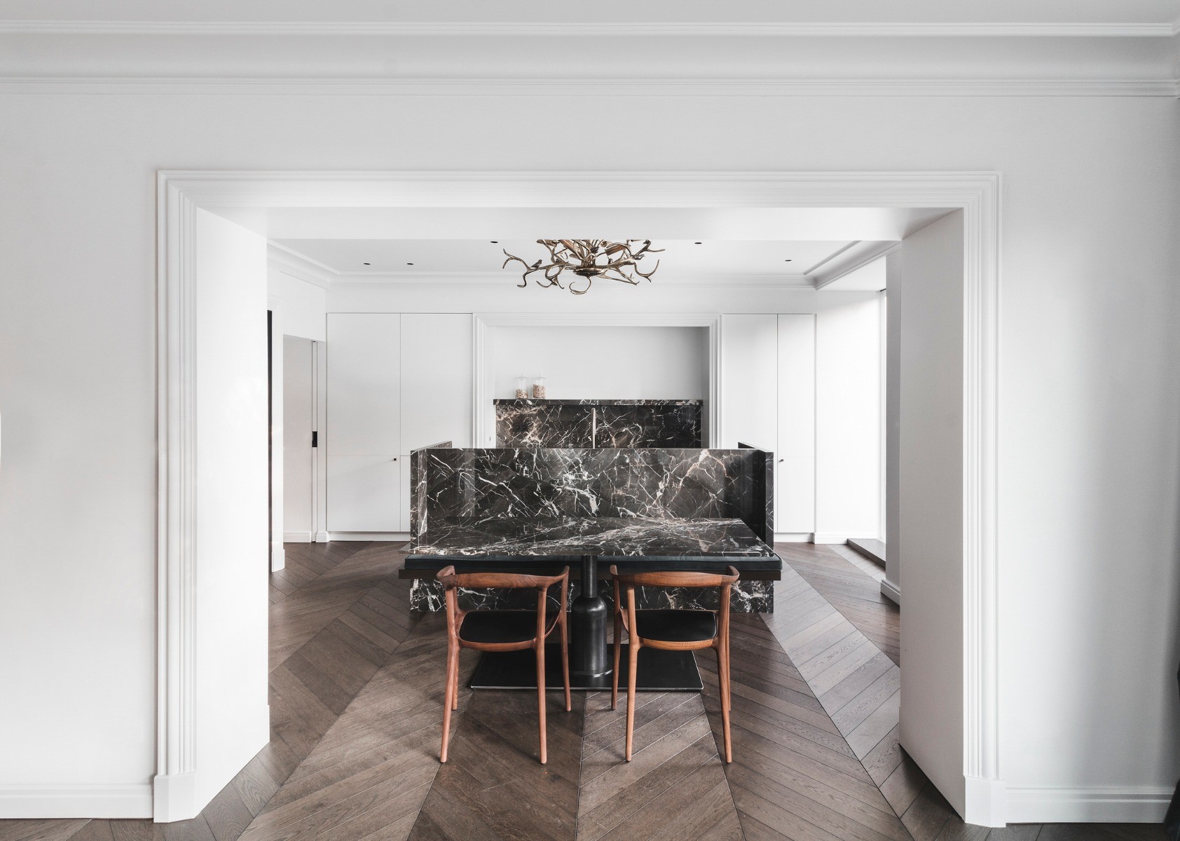 В зале и переходных пространствах вертикальные элементы — панели и пилястры — вытягивают стены, направляют взгляд и подчеркивают ключевые архитектурные точки. Повторение одних и тех же профилей создает целостность и поддерживает единую линию оформления.