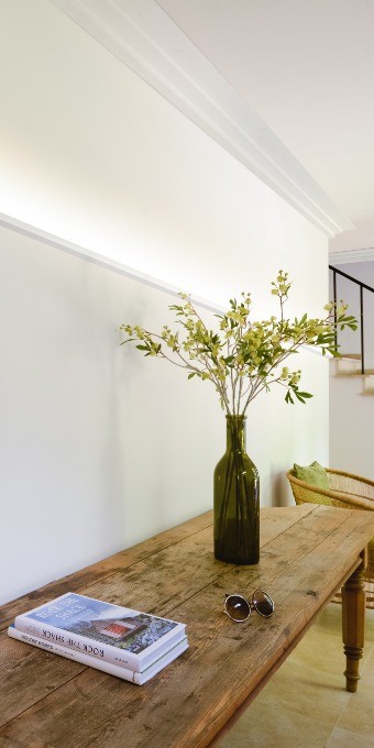 Строгий и современный профиль из серии Steps. Здесь мы разместили самую длинную сторону карниза на потолке, чтобы визуально расширить помещение. Модель имеет срезанный угол сверху и снизу, благодаря чему создается тонкая линия тени. Разработан дизайнером Орио Тонини.