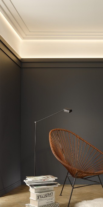 Этот строгий и современный профиль из серии Steps также может использоваться для перекрытия светодиодов. Модель имеет срезанный угол сверху и легкий, благодаря чему возникла тонкая линия тени. Разработан дизайнером Орио Тонини.